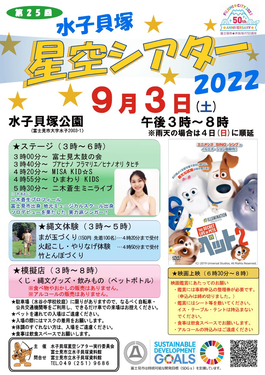 \🎊市制施行50周年記念事業/ 📣水子貝塚星空シアター2022 当日(9月3日)は、ららぽーと富士見屋外広場で星空シアター(上映作品「ペット2」)の同時上映を行います✨ 詳しくはホームページで! ※水子貝塚公園会場の申込みは締め切りました。 #富士見市50周年 https://www.city.fujimi.saitama.jp/madoguchi_shisetsu/02shisetsu/shiryoukan/mizukokaiduka/event/2011-0905-1142-126.html